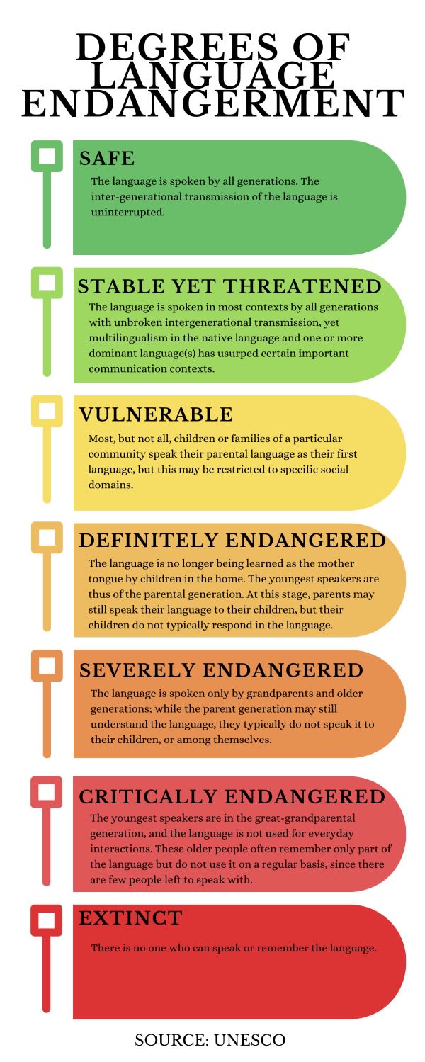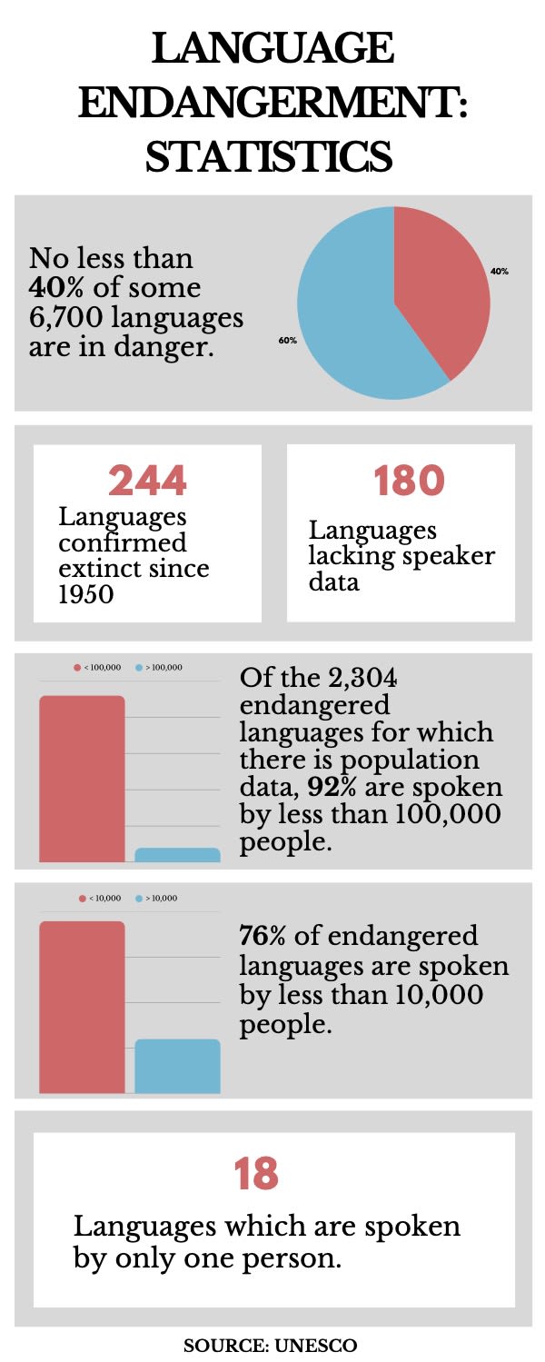 “There is also a phenomenon called chain endangerment. This happens when smaller, local languages are taken over by regional languages, those regional languages are taken over by other regional languages, and those ones are taken over by larger colonial languages.”
