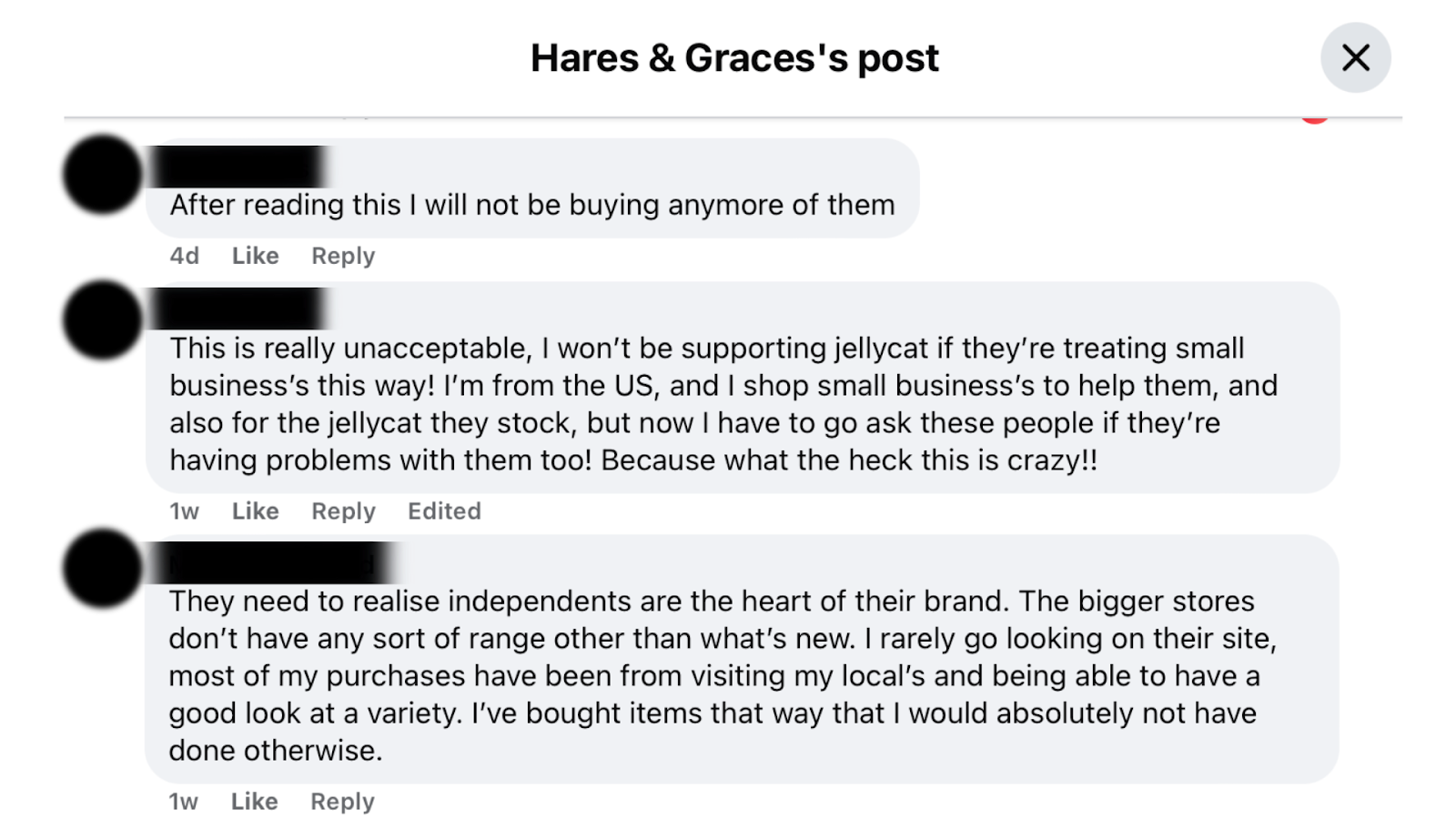 Customers, however, expressed their opinions in the post comments with several stating they will no longer be collecting Jellycats.