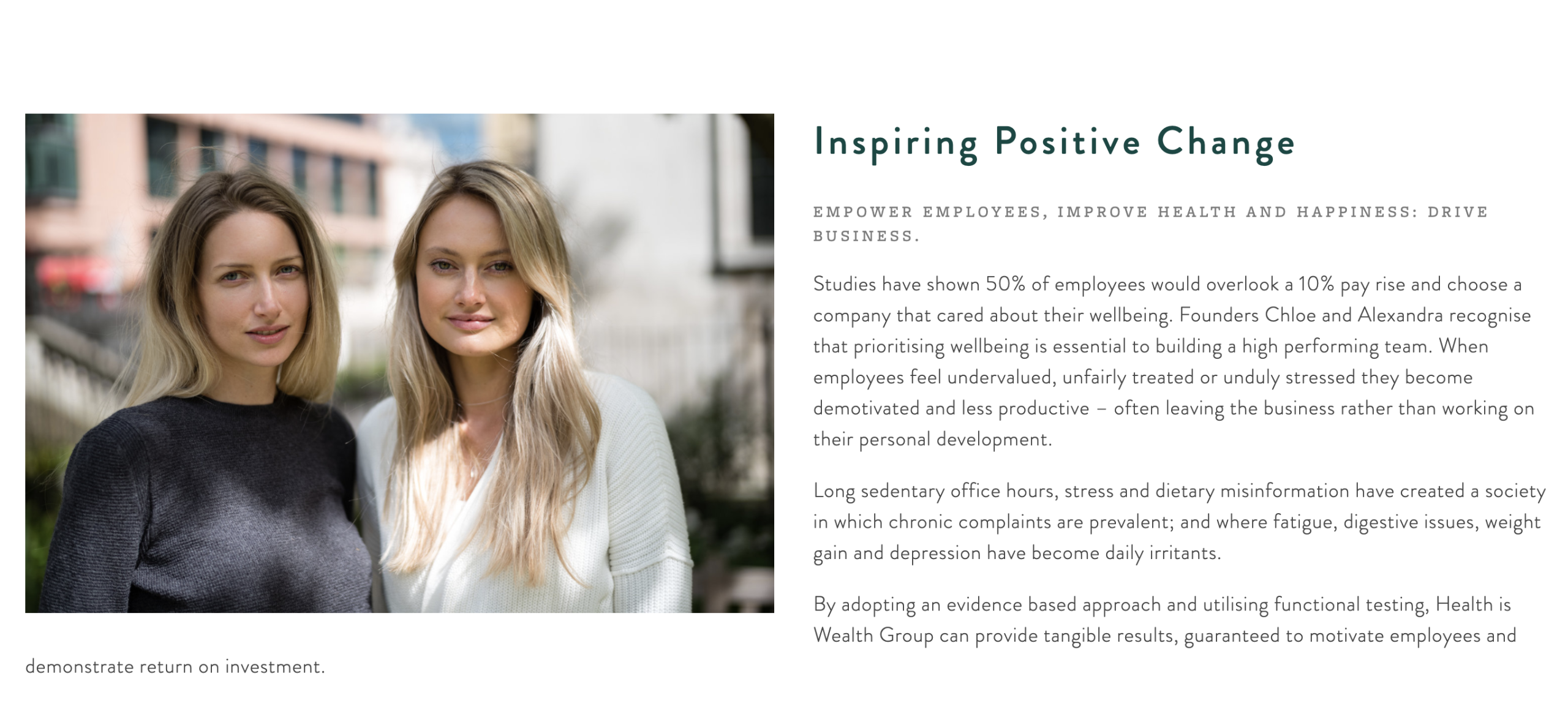 Business for Health is Wealth has become more in demand this year, as the reputation of the company has grown along with their client base. Alex explained: “Also, employees are demanding it more. Young adults, millennials care less about money and more whether or not the business they work for actually cares about them.”