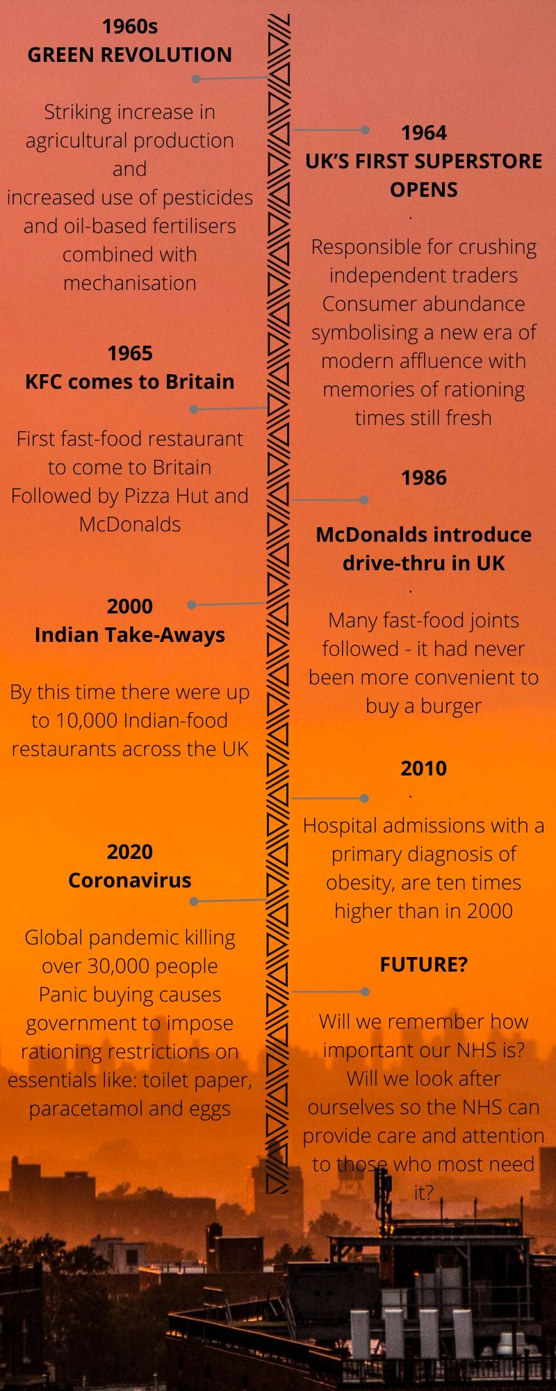 Then food rationing that didn't end until near-nine years after World War II, still fresh in people's minds as the agricultural industry boomed and superstores opened - closely followed by American fast-food restaurants making their way to Britain. By 2010, the hospital admissions for obesity were ten times higher than a mere decade earlier. It really isn't surprising, looking at the order of things, that Britain's health is now so poor.