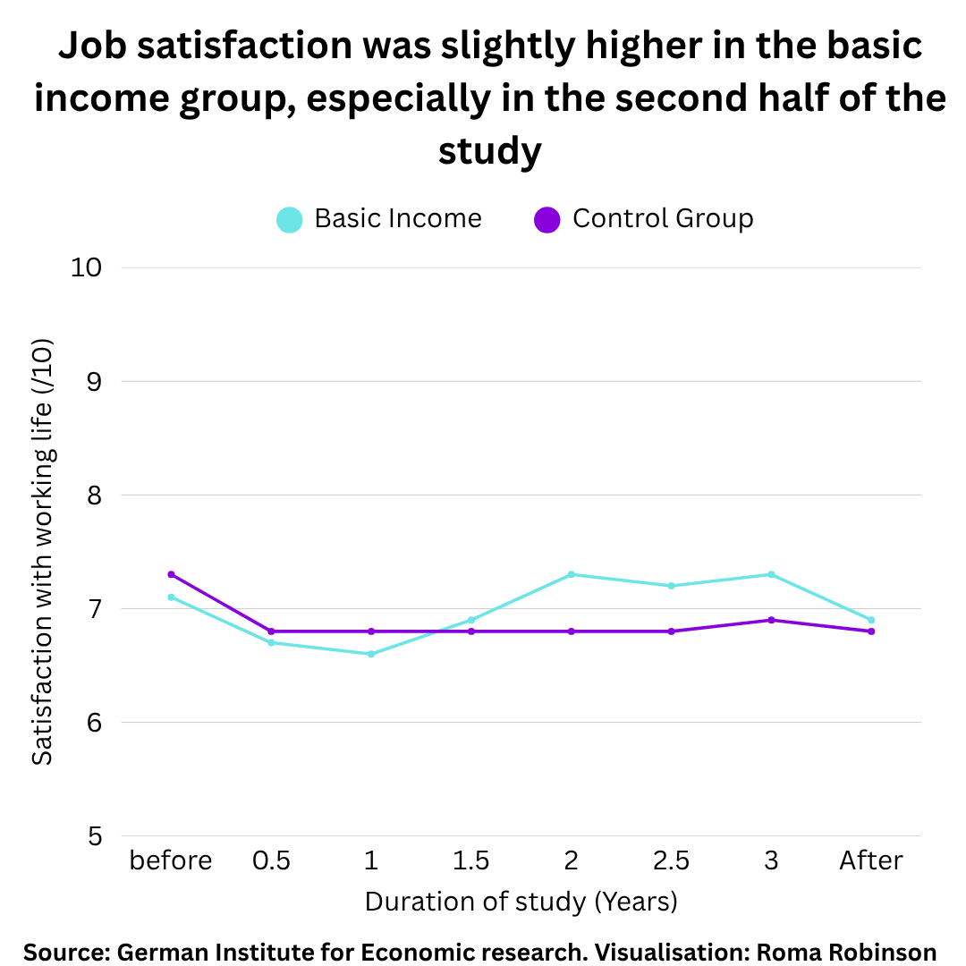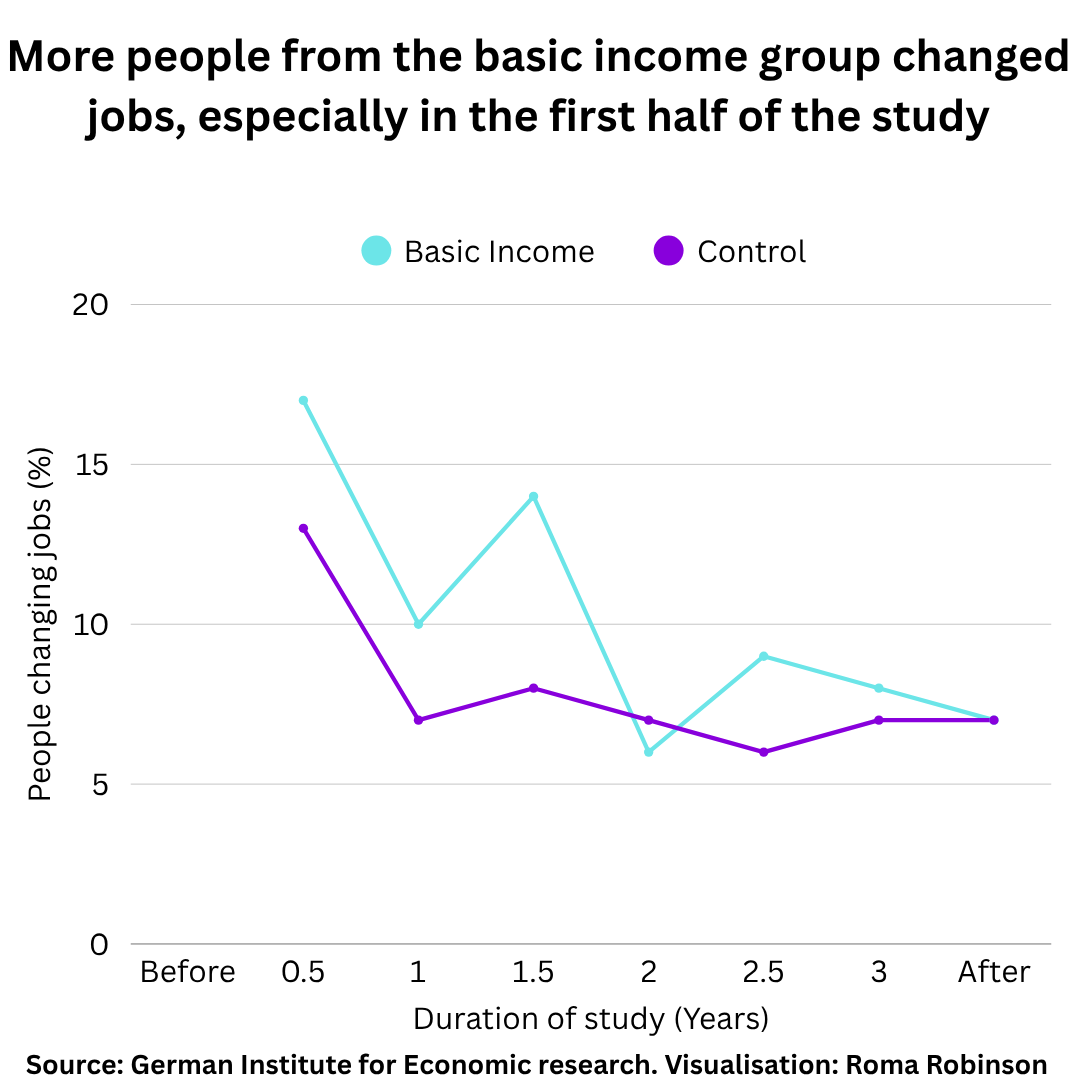 They found that employment rates were no different between the two groups. In the first 18 months of the study more from the basic income group left their job and took up others - and in the latter 18 months there was greater satisfaction in work.