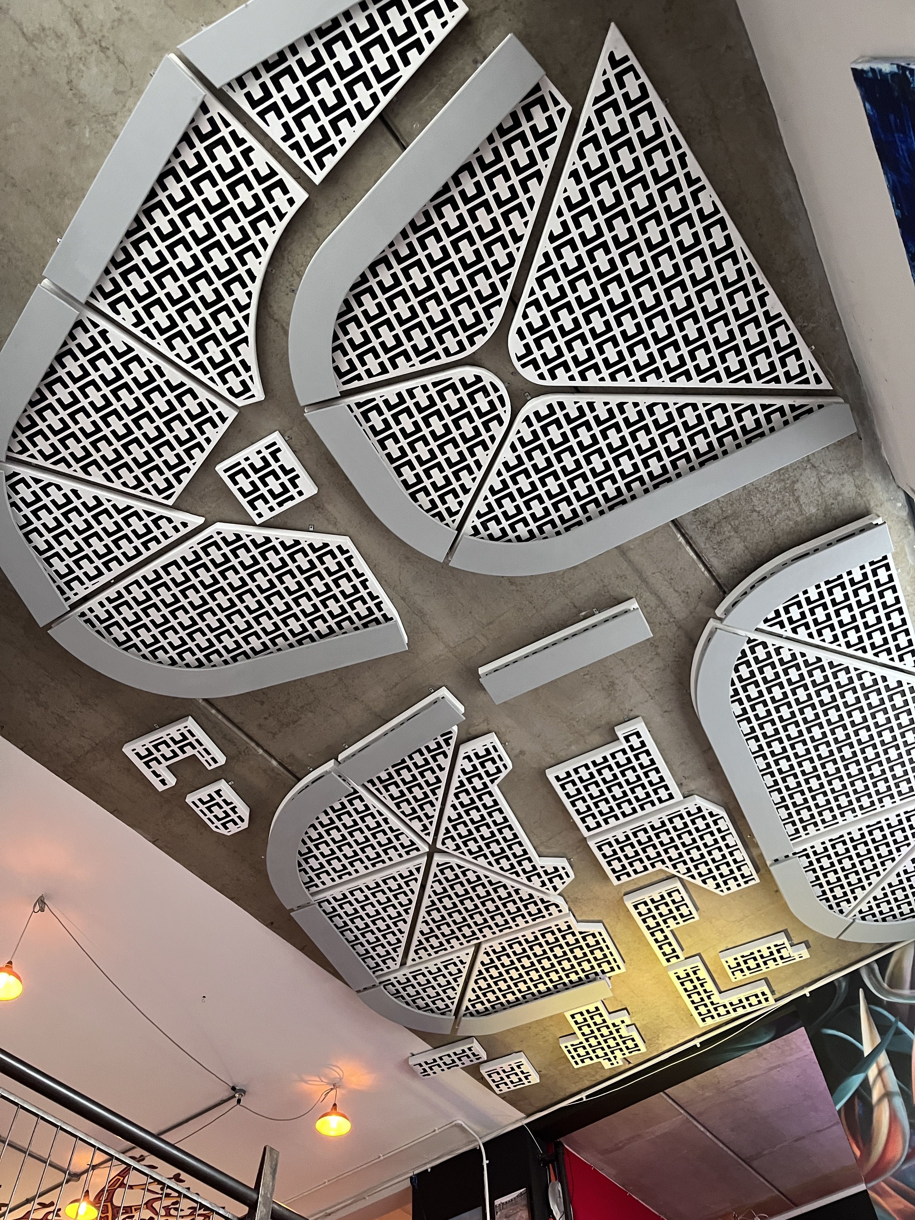 An aerial of the old Hulme Crescents, on the ceiling at Kim's Kitchen bar underneath Homes for Change. Image by Serena Murphy