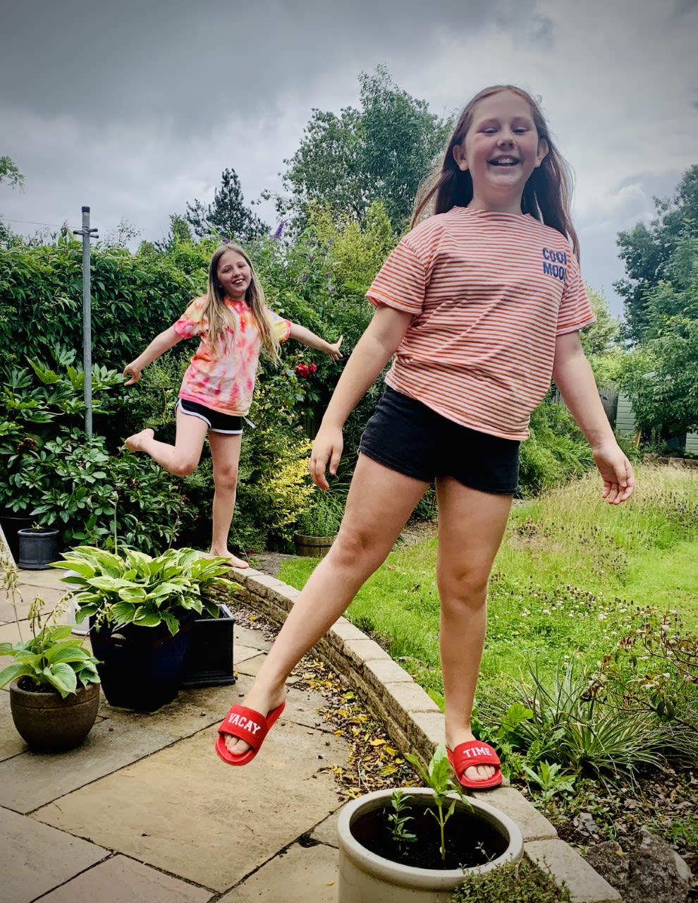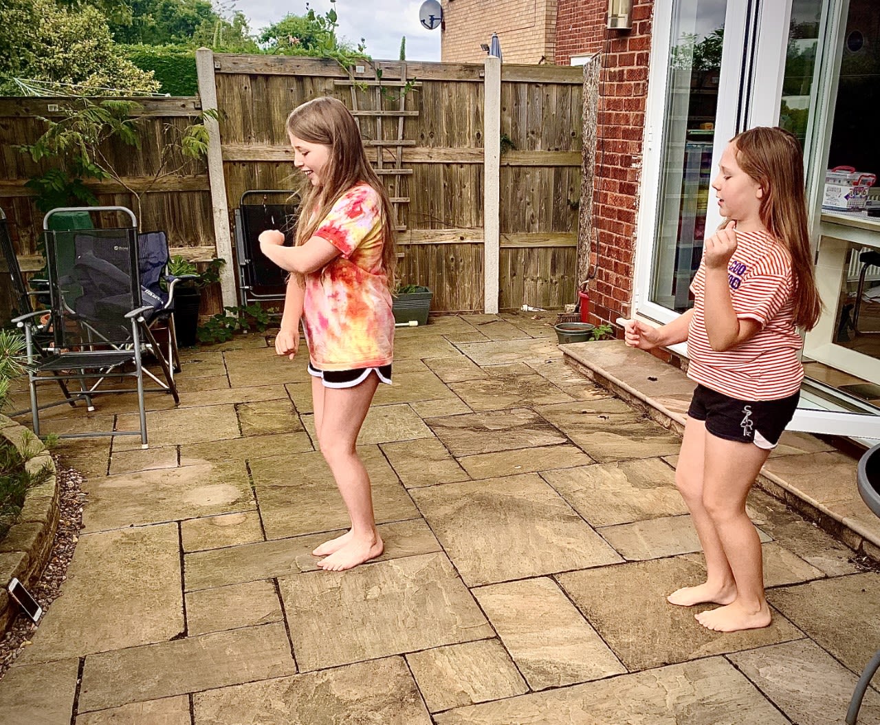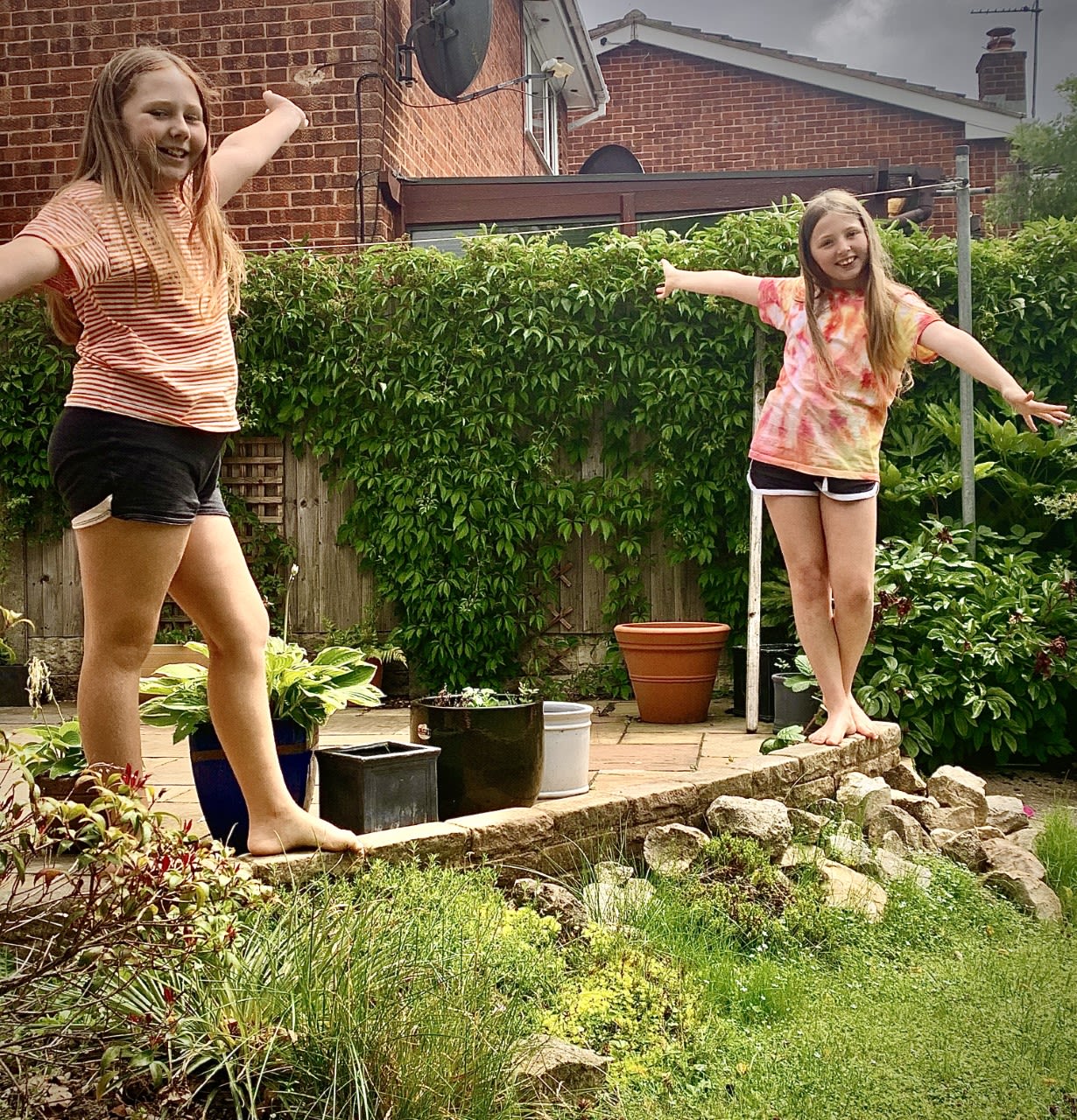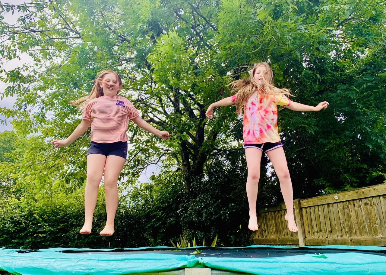 Holly (left) and Eve (right) stick to social distancing while they play outside