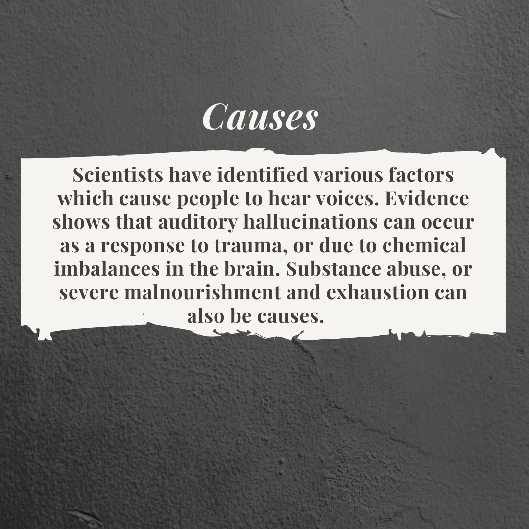 Sufferers describe it as hearing the voice of a person completely external to themselves- except there’s no one there. They may know or not know the voices, and sometimes the voices can speak directly to them- telling them to do things, calling them names.